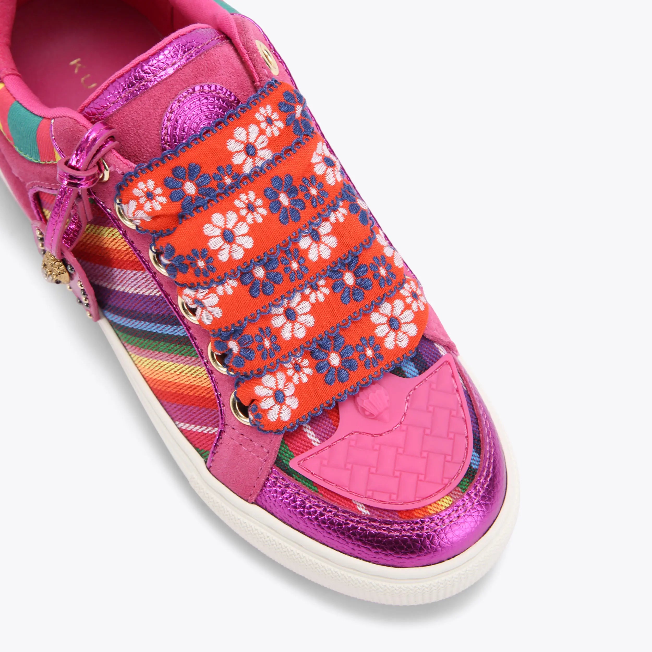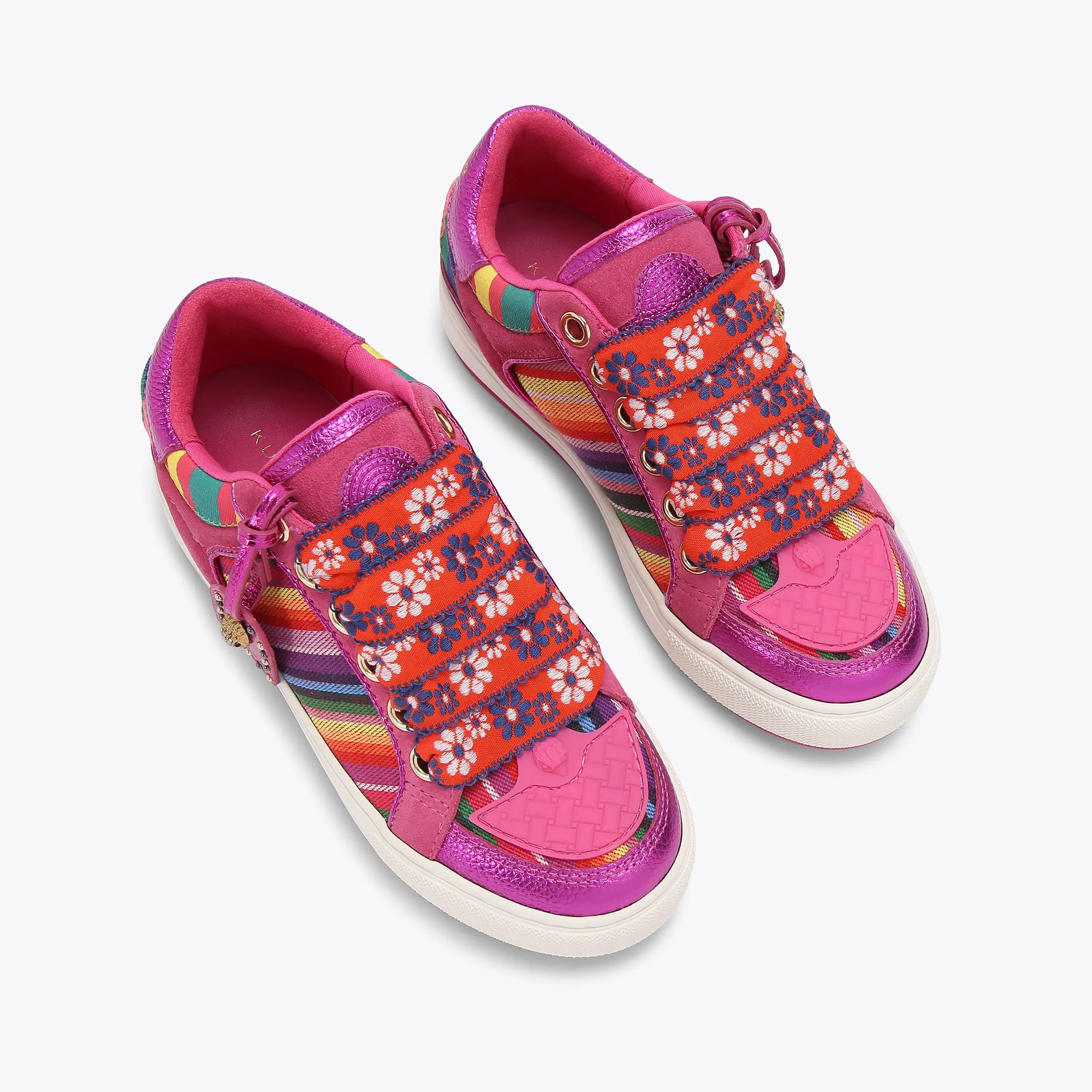 Bu Southbank Tag sneaker, pembe deri üzerine her iki yanında çok renkli çizgili panellerle tasarlanmıştır. Ön kısmında turuncu ve mavi çiçek desenli geniş bağcıklar bulunur ve metalik pembe bagaj etiketi tarzında bir aksesuarla tamamlanır. Canlı renk paleti ve özgün detaylarıyla dikkat çeken bu model, günlük stile enerjik ve modern bir dokunuş katar.